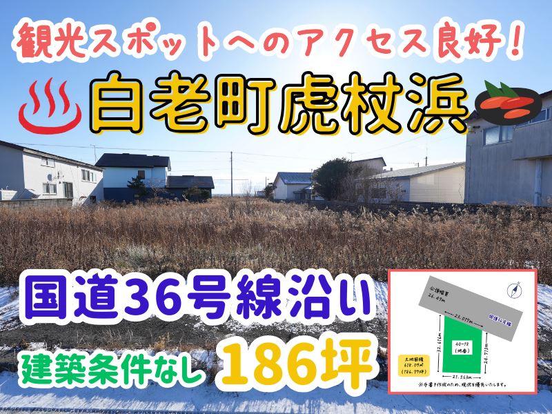 ✨値下げいたしました✨ 🔶国道36号線沿いの好立地🌈白老町虎杖浜の宅地約186坪です🎵 🔶建築条件がないため、ご希望のハウスメーカー・工務店様で建築可能🏠 🔶周辺はおいしい海産物も手に入りやすく、温泉も複数ございます🎵 🔶虎杖浜駅まで徒歩6分🚃観光スポットへのアクセスも良く、ナチュの森・マリンパークニクス・伊達時代村・クマ牧場・登別温泉も車で15分圏内です✨ 🔶詳細はエイシン不動産までお気軽にお問い合わせください😊