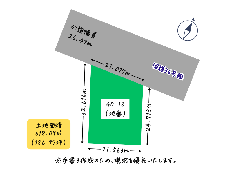 接地状況: 北側 幅26.49mの公道に23.017m接道