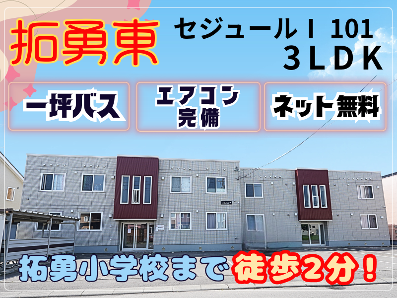 【エアコン付き物件】拓勇小学校すぐ近くの1階角部屋3LDKです😊 並列駐車2台無料🚙駐輪場・物置もあり、タイヤや自転車の置き場所にも困りません👍 Wi-Fiアクセスポイント付きインターネットも無料でご利用可能🎮 玄関・リビング・各居室に収納付きで整理整頓しやすく、お部屋を広々と使うことができます♫ 浴室は1坪以上&追い焚き機能付き🛀足を伸ばしていつでも温かいお湯に浸かれます🫧 小学校・中学校・認定こども園が徒歩15分圏内⭐公園も複数あり、子育て世帯にぴったりの住環境🌈 さらに、郵便局・コンビニ・金融機関・沼ノ端交流センター・フードD・ツルハドラッグ・無印良品も徒歩15分圏内に揃っており、利便性も良好です🙌 詳細はエイシン不動産までお気軽にお問い合わせください😊